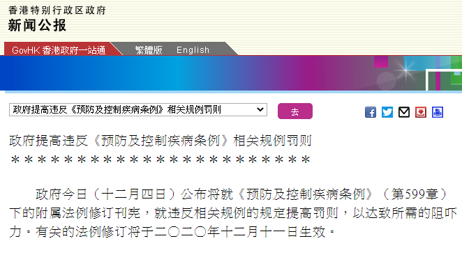 食物及衞生局發言人表示,防疫抗疫有賴市民的合作和自律,嚴格遵守各項防疫抗疫措施,避開人群聚集、保持社交距離及做好個人衞生。政府過去數月已在《預防及控制疾病條例》下推出多項規例,以減低人流和社交接觸,阻止病毒在社區傳播。面對疫情高峰期,除了收緊各項感染控制措施外,政府有必要提高有關罰則,以達致所需的阻嚇力,確保市民嚴格遵守相關規定。