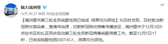 據內蒙古滿洲里市委宣傳部官方微博「魅力滿洲里」 消息,滿洲里市於12月3日8點在市區和紮區同步啟動第三輪全員新冠病毒核酸篩查工作。截至12月5日17時,已完成核酸檢測200745人,結果均為陰性。