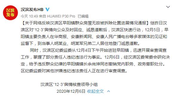 12月6日,經漢濱區委常委會研究決定,給予違反群眾紀律的早陽鎮鎮長余尚坤同志撤銷黨內職務、政務撤職處分。漢濱區紀委監委對其他涉嫌違紀違法責任人正在進行審查調查。