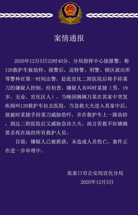 據河北省張家口市公安局宣化分局微信公眾號消息,12月5日22時40分,宣化分局指揮中心接報警,稱120救護車被劫持。接警後,巡特警、刑警、轄區派出所等警種在第一時間出警,趕赴宣化二附醫院後將手持菜刀的嫌疑人控制。