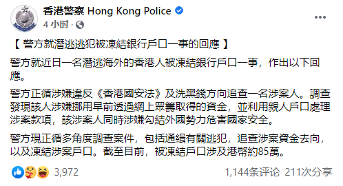 立法會前議員許智峯假釋期間棄保潛逃至丹麥後聲稱「流亡」。警務處處長鄧炳強6日不點名指斥許智峯事前涉向法庭「講大話」,以前往開會作藉口,實際是「走佬」,其做法「無良心」及「不負責任」;並指他對不起家人,作為棄保潛逃者應感到羞恥。此外,就近日一名潛逃海外的港人被凍結銀行戶口一事,警方回應指正循涉嫌違反香港國安法及「洗黑錢」方向追查。調查發現,該人涉嫌挪用早前透過網上眾籌取得的資金,並利用親人戶口處理涉案款項,而該涉案人同時涉嫌勾結外國勢力危害國家安全。警方現正循多角度調查案件,包括通緝有關逃犯,追查涉案資金去向,以及凍結涉案戶口。截至目前,被凍結戶口涉及港幣約85萬元。