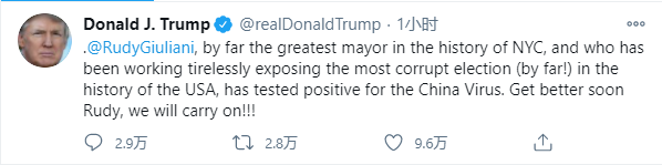 香港時間淩晨4時左右,特朗普在推特帖文表示其私人律師朱利亞尼確診感染新型冠狀病毒。