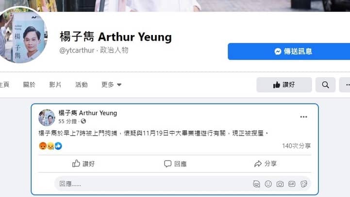楊子雋的社交網站專頁表示,警方今早約7時上門拘捕楊子雋,懷疑與11月19日中大畢業禮遊行有關,警方在其住所搜查。