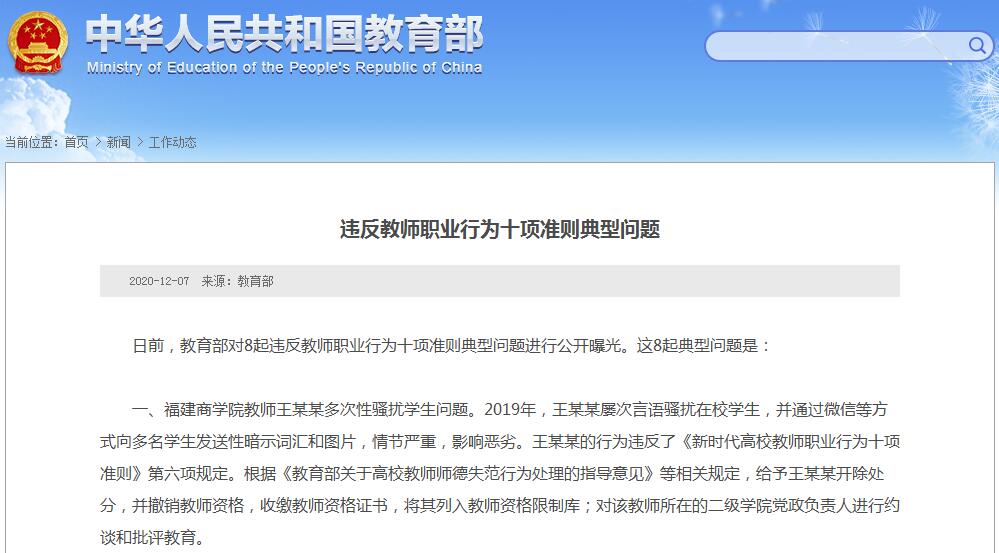 一、福建商學院教師王某某多次性騷擾學生問題。2019年,王某某屢次言語騷擾在校學生,並通過微信等方式向多名學生發送性暗示詞彙和圖片,情節嚴重,影響惡劣。王某某的行為違反了《新時代高校教師職業行為十項準則》第六項規定。根據《教育部關於高校教師師德失范行為處理的指導意見》等相關規定,給予王某某開除處分,並撤銷教師資格,收繳教師資格證書,將其列入教師資格限制庫;對該教師所在的二級學院黨政負責人進行約談和批評教育。