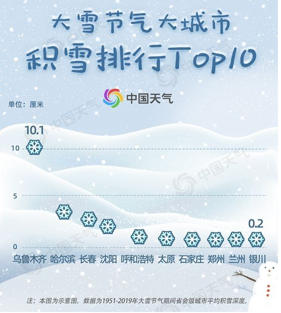 中國天氣網統計了1951年至2019年省會級城市的降雪數據,大雪節氣期間,烏魯木齊平均降雪日數能達到8天,遇雪概率超過五成;哈爾濱和長春在大雪節氣期間的遇雪概率大約為三成,與小雪節氣相比,這幾個城市的遇雪概率都有所提高。此外,瀋陽、西寧、呼和浩特、西安、鄭州的降雪概率也有一二成。