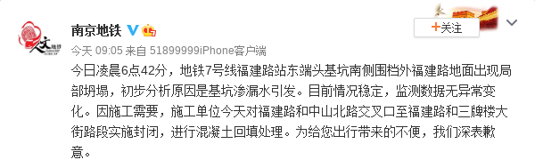 據江苏南京地鐵官方微博消息顯示,今日淩晨6點42分,地鐵7號線福建路站東端頭基坑南側圍檔外福建路地面出現局部坍塌,初步分析原因是基坑滲漏水引發。目前情況穩定,監測數據無異常變化。因施工需要,施工單位今天對福建路和中山北路交叉口至福建路和三牌樓大街路段實施封閉,進行混凝土回填處理。