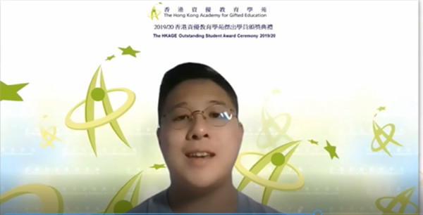 香港資優教育學苑向升讀科技大學的李智滔頒發傑出學生獎,以表揚他積極為學員策劃不同類型的活動。