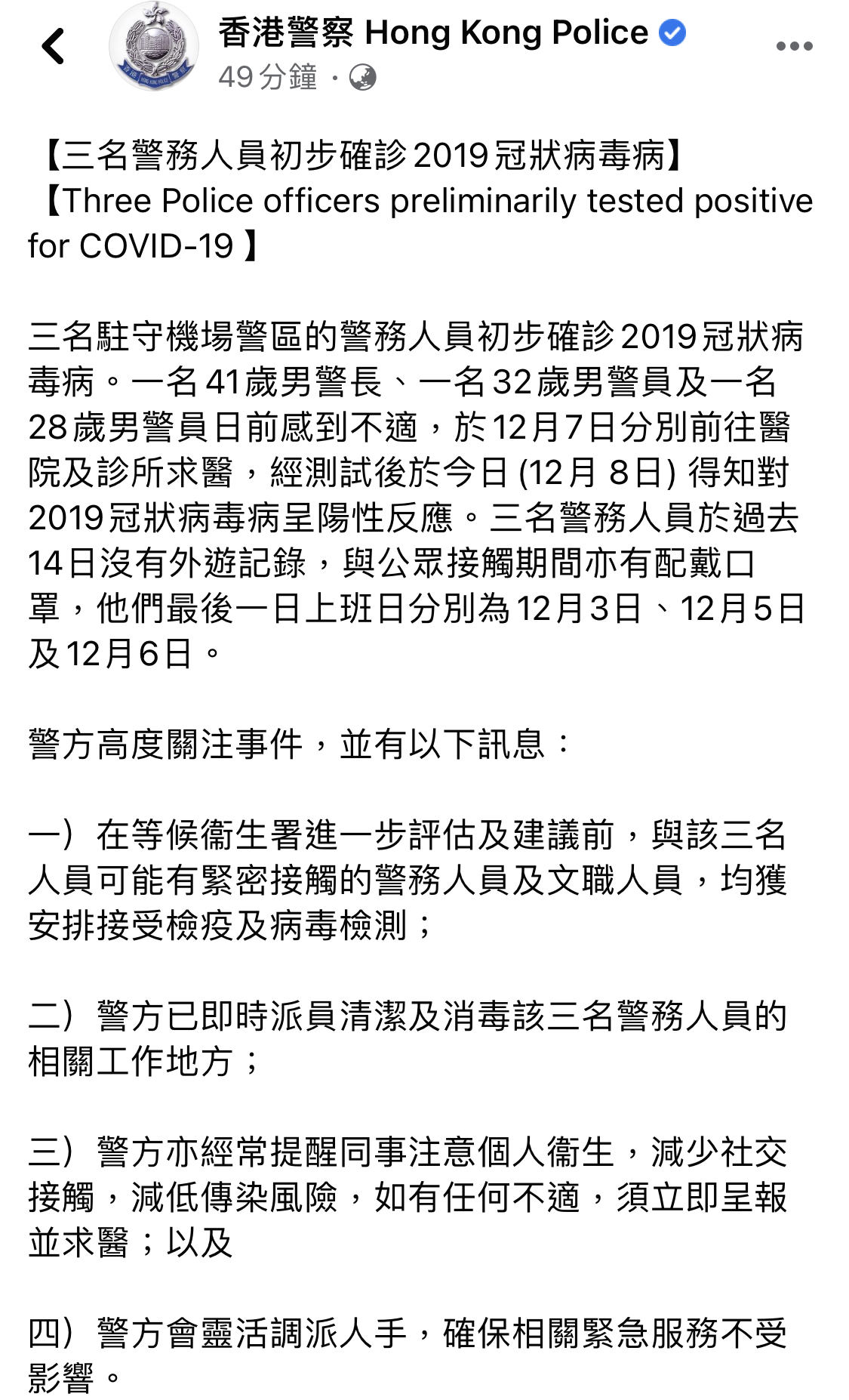警方稱,三人於日前感到不適,分別於十二月七日前往醫院及診所求醫,經測試後於八日得知對2019冠狀病毒病呈陽性反應。三名警務人員於過去十四日沒有外遊紀錄,與公眾接觸期間亦有配戴口罩。