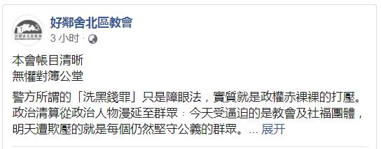 今日(9日)上午8時,「好鄰舍北區教會」又在Facebook專頁發文質疑警方指控,聲稱無懼對簿公堂。