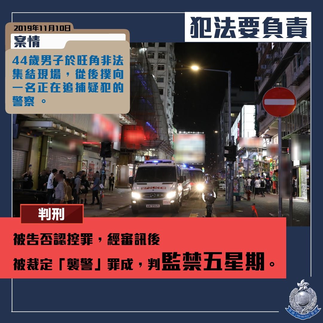 警方今日(9日)在社交平台發文,指1名44歲男子於去年11月10日在旺角從後撲向1名正在追捕疑犯的警察,被控「襲警」罪。
