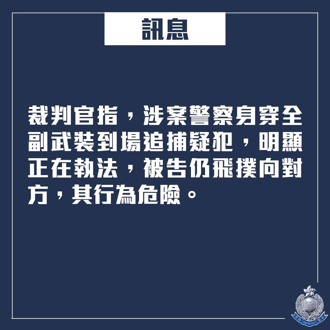 警方在帖文引述裁判官指,涉案警察身穿全副武裝到場追捕疑犯,明顯正在執法,被告仍飛撲向對方,行為危險,因此須判處具阻嚇性懲罰。