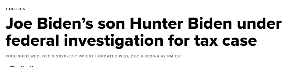 亨特·拜登在聲明中說:「我會非常認真地對待調查,但我相信一個專業而客觀的審查將證明我合法並妥當地處理了相關事務,包括與專業稅務顧問的往來。」聲明的最後附上了一份來自拜登和當選副總統哈里斯過渡團隊的簡短聲明,該聲明說:「當選總統拜登深深地為他的兒子感到驕傲。亨特經歷了眾多嚴峻挑戰,包括最近幾個月的惡意人身攻擊,但他只會變得更強大。」