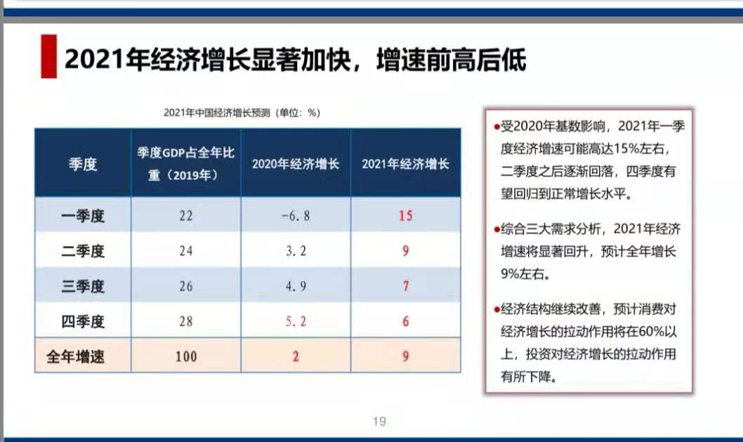 交行金融研究中心12月10日發布研究報告認為,2021年經濟增速顯著加快,走勢前高后低。綜合三大需求分析,2021年經濟增速將顯著回升,預計全年增長9%左右。受2020年基數影響,2021年一季度經濟增速可能高達15%左右,二季度之後逐漸回落,四季度有望回歸到正常增長水平。經濟結構繼續改善,預計消費對經濟增長的拉動作用將在60%以上,投資對經濟增長的拉動作用有所下降。