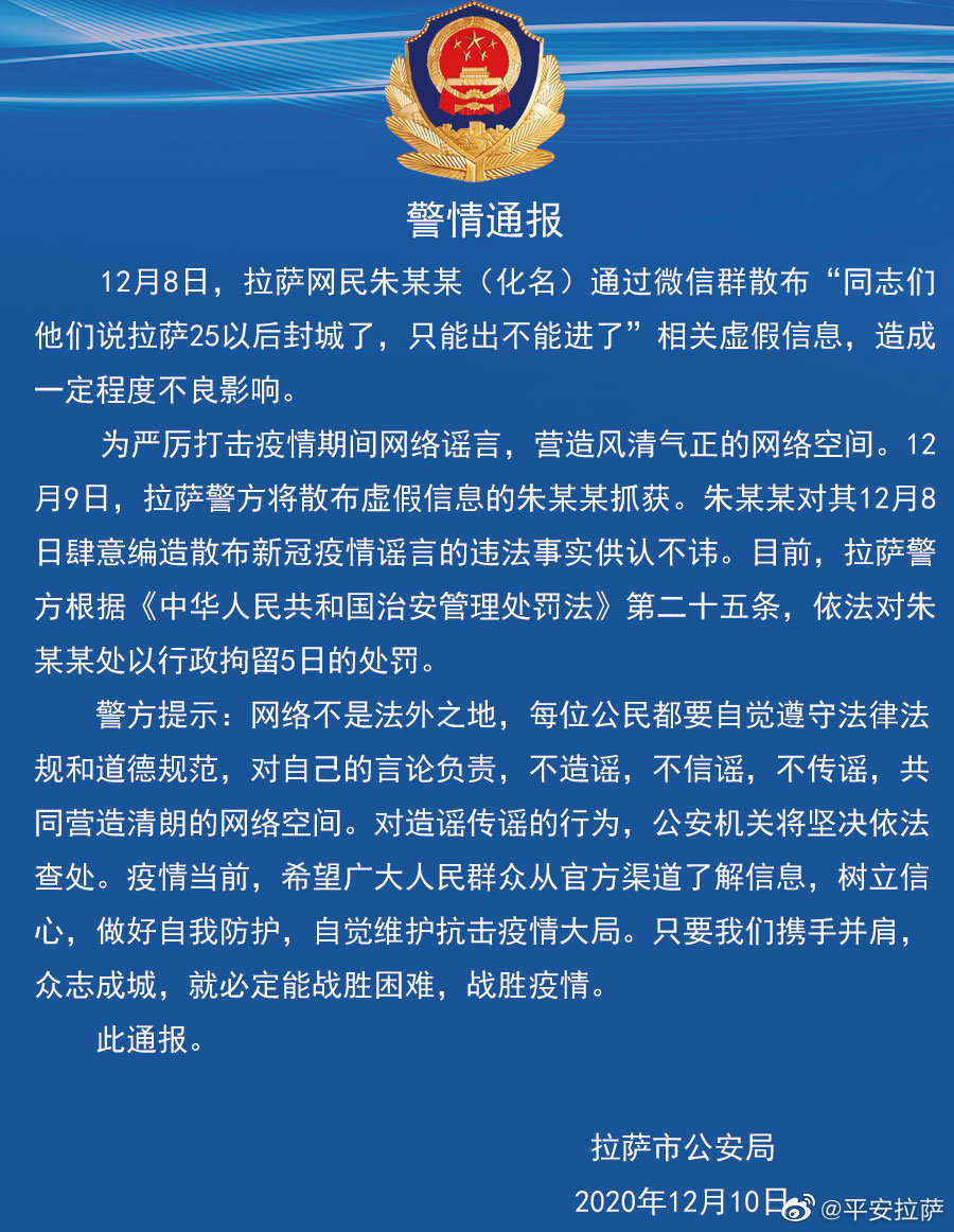 據西藏拉薩市公安局12月10日通報,12月8日,拉薩網民朱某某(化名)通過微信群散布「同志們他們說拉薩25以後封城了,只能出不能進了」相關虛假信息,造成一定程度不良影響。