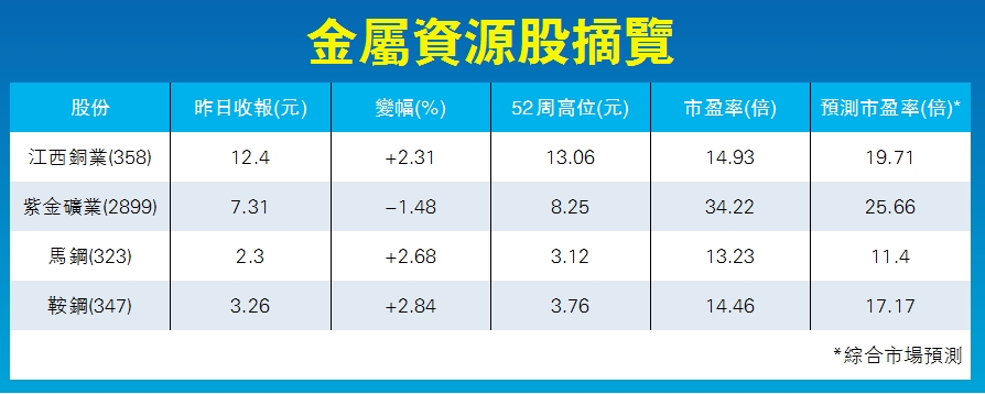 講到受惠銅價上漲的股份,可留意江西銅(358)及紫金礦業(2899)。其中,江西銅是內地最大的銅生產商,同時生產黃金及銀。高盛看好銅價後市升勢,並預期精銅市場供需缺口加大。該行認為江西銅可受惠,將其評級升至「買入」,目標價由8.5元升至11.3元。