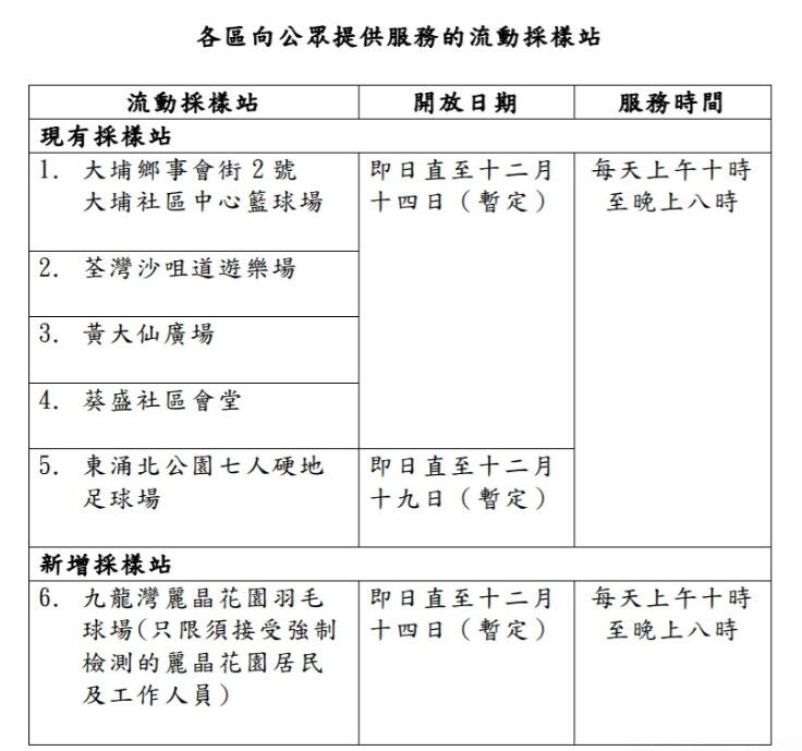 港府早前已在大埔、荃灣、黃大仙、葵盛及東涌透過流動採樣站為市民提供免費核酸檢測服務。現時,各區向公眾提供服務的流動採樣站的開放日期及服務時間見下圖: