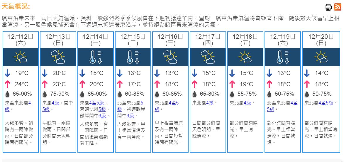 天文台預告,一股強烈冬季季候風會在下周初抵達華南,星期一廣東沿岸氣溫將會顯著下降,隨後數天該區早上相當清涼。另一股季候風補充會在下周周末抵達廣東沿岸,並持續為該區帶來清涼的天氣。