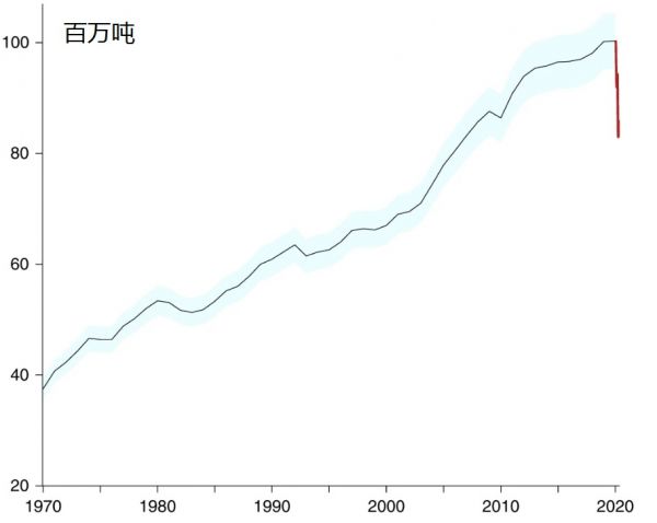 報道稱,今年全球碳排放量預計減少大約24億噸,遠遠大于之前的年度創紀錄降幅,例如二戰結束時下降9億噸以及2009年金融危機最嚴重時下降5億噸。
