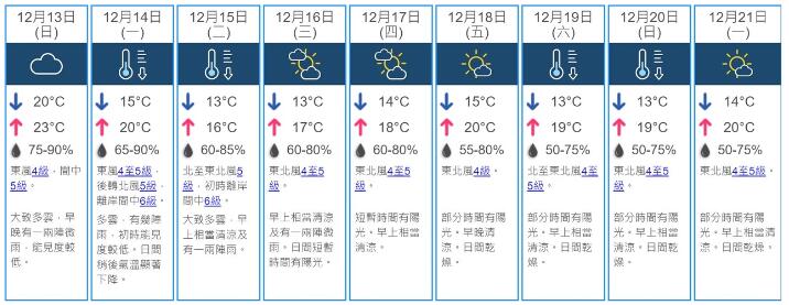 天文台指,12日下午及晚上大致多雲,有一兩陣微雨,吹和緩東至東北風。不過,和暖天氣僅持續至明日,天文台預料一股強烈冬季季候風將於下周一(14日)抵達華南沿岸,屆時東風風力達4至5級,離岸風力間中會達到6級,本港氣溫將會顯著下降,最低溫度只有13度。