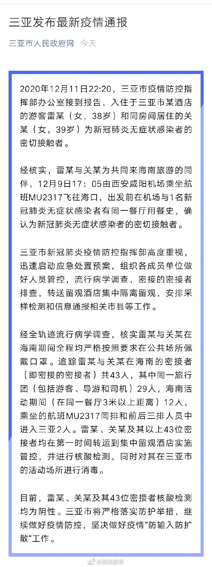 三亞兩名遊客為無症狀感染者的密接者,雷某(女,38歲)與關某(女,39歲)12月9日由西安咸陽機場乘坐航班MU2317飛往海口,出發前在機場與1名新冠肺炎無症狀感染者有同一餐廳用餐史。12月11日,三亞市疫情防控指揮部辦公室接到報告兩人為新冠肺炎無症狀感染者的密切接觸者。