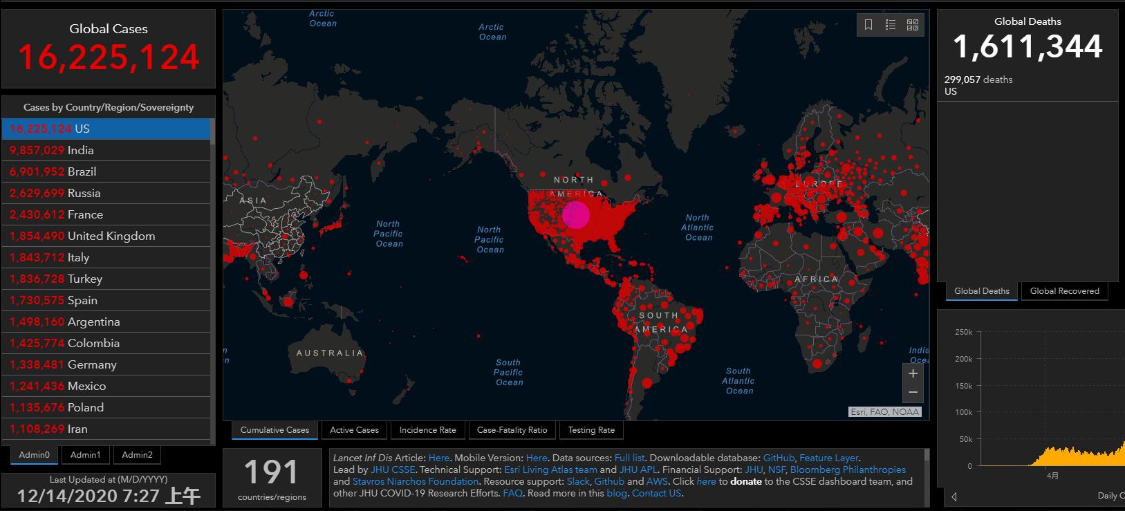 美國約翰斯·霍普金斯大學統計數據顯示,截至香港時間今早7時27分,美國累計新冠肺炎確診病例達到16,225,124例;累計死亡病例達299,057例。另據美媒13日報道,美國累計新冠確診病例達第一個800萬例用時268天,第二個800萬例僅57天。目前,美國平均每小時近100人死於新冠肺炎。