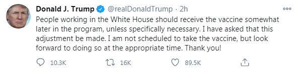 不過特朗普其後發推文,說自己已經要求「調整」白宮職員接種的計劃,指除非有特別需要,否則白宮人員會在疫苗接種計劃的較後時間才接受注射。曾感染新冠病毒的特朗普又說,暫時未決定何時接種,但期待在適當時間這樣做。
