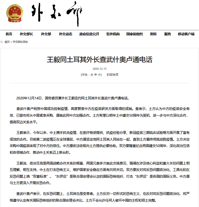 據外交部網站15日消息,2020年12月14日,國務委員兼外長王毅應約同土耳其外長查武什奧盧通電話。