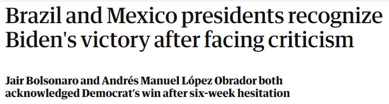 據美媒消息,巴西和墨西哥領導人終於承認拜登當選,並向拜登送祝福。