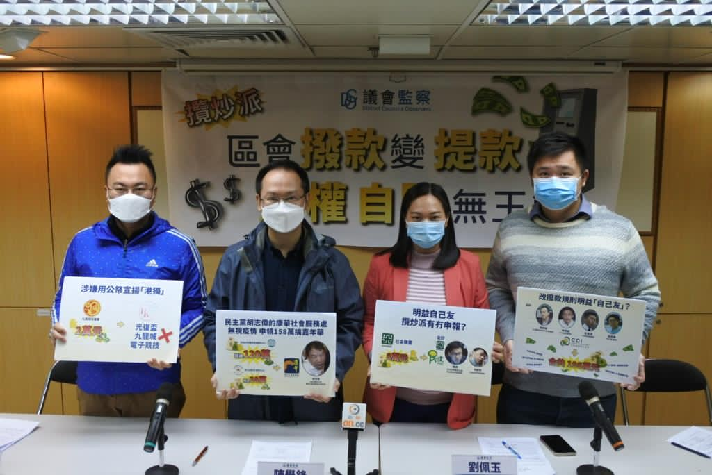 「議會監察」表示,在區議會撥款上,出現了明益「自己友」、活動撥款海鮮價和利益衝突無申報的現象,其中一個例子是「民社服務中心有限公司」,「議會監察」指它與民協友好,在深水埗區議會申請9萬元舉辦「社區傳書2020」行動,但「議會監察」召集人兼深水埗區議員劉佩玉指民協區議員並未有就此作出利益申報。