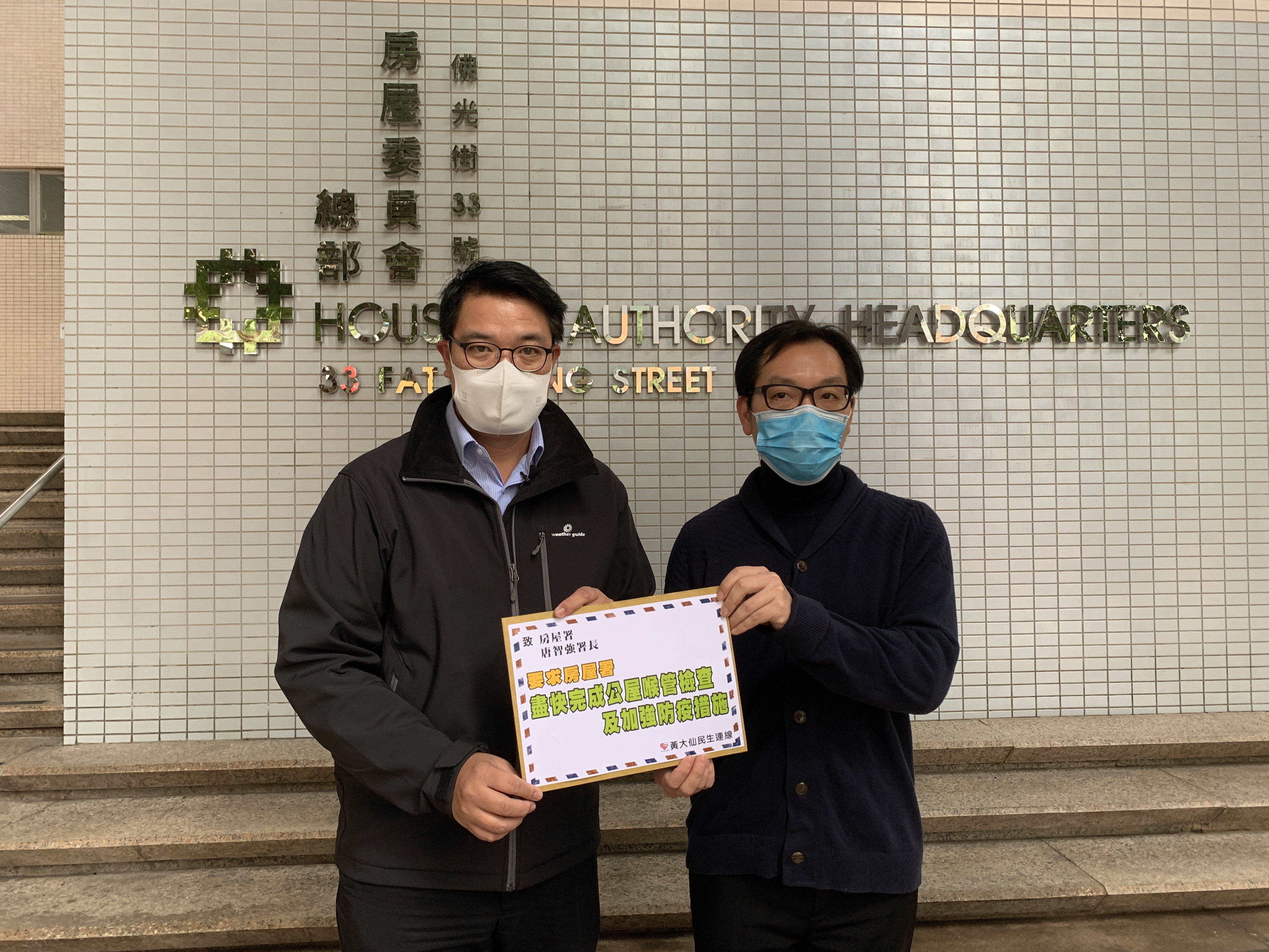 黃大仙民生連線指,副召集人黎榮浩及其他成員今日(17日)到房委會請願,就區內多個公共屋邨爆發新冠肺炎疫情,向房委會提出要求。