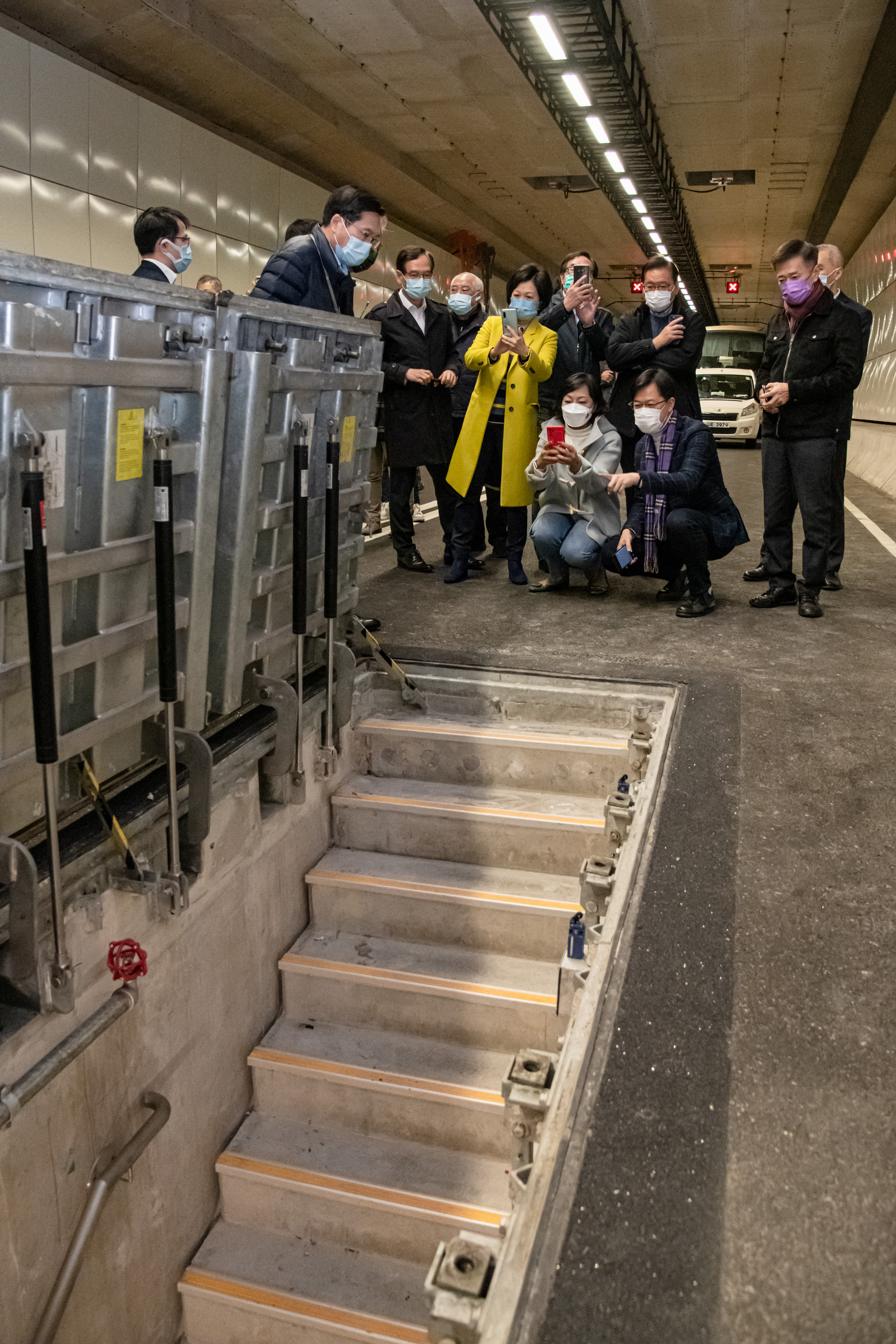 議員視察屯門──赤鱲角隧道行車道下方的公用設施走廊。走廊內設有排水管道、消防喉管、供電及訊號系統裝置等,讓部分日常維修工作可在隧道行車期間同時進行。