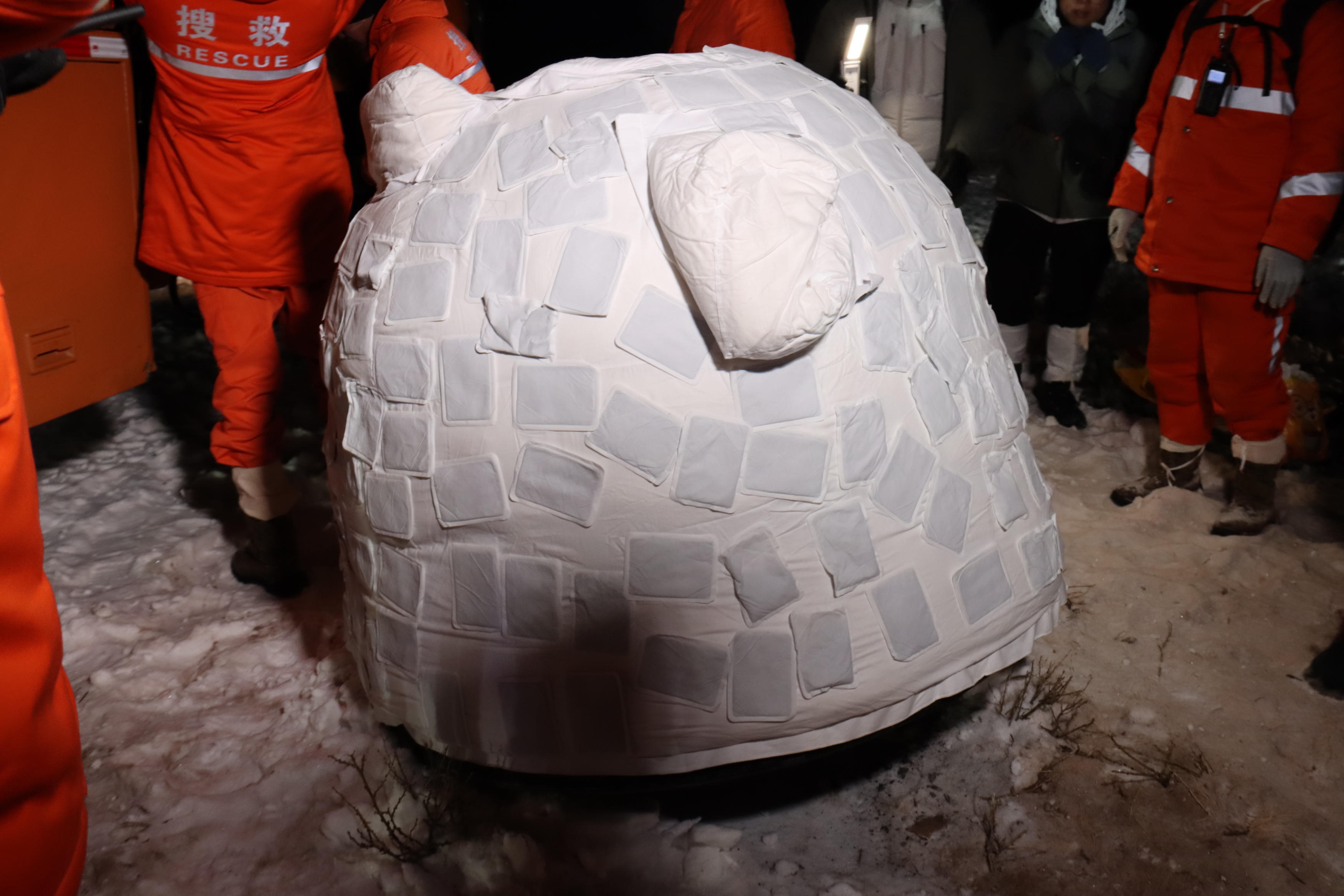 據地面回收人員介紹,這是因為著陸時正值淩晨,返回艙內部的推進劑還有剩餘。為給返回器保溫,防止剩餘燃料被凍住、增加後續處置的難度,便採取了此類暫時保暖的方法。有網友因此感歎,「高端的設備,往往只需要最樸素的保溫方式」。