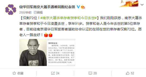 18日,從侵華日軍南京大屠殺遇難同胞紀念館官方微博獲悉,南京大屠殺幸存者賀孝和於今日(18日)淩晨去世,享年91歲。賀孝和老人是今年去世的第5位幸存者,目前經南京侵華日軍受害者援助協會認證的在冊在世的幸存者僅剩72位。願老人一路走好!