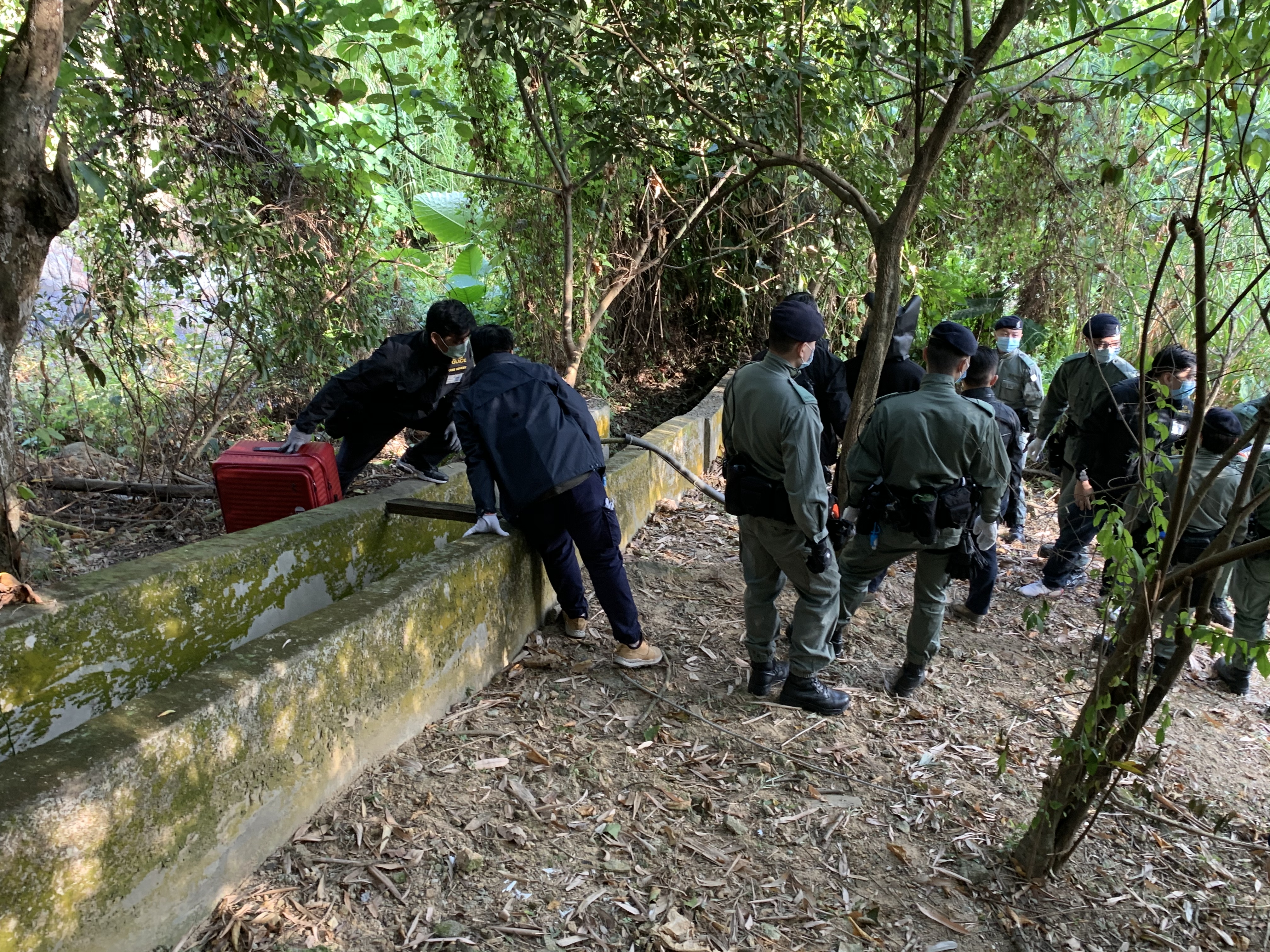 疑犯被押到荃灣荃錦公路山坡搜證,警方尋回一個紅色行李箱。