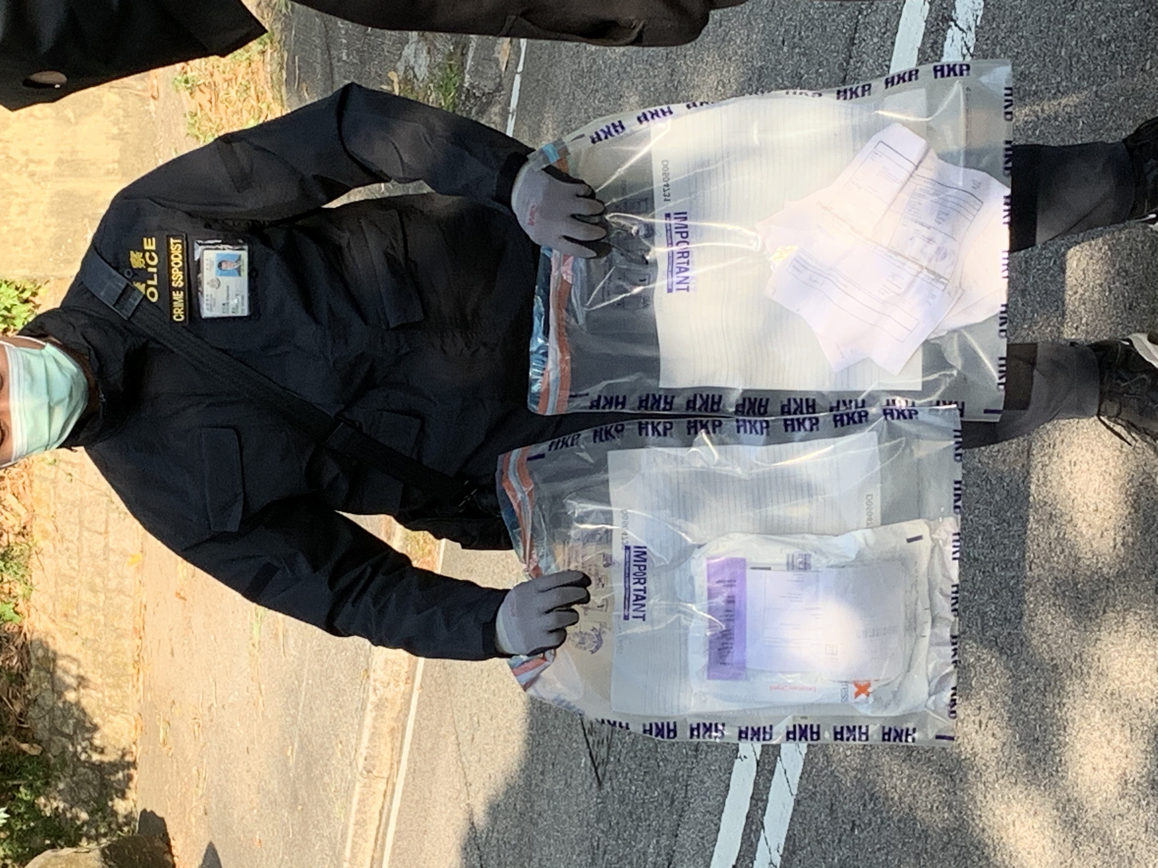 警方在部分單位搜出失物,另外在屯門一個迷你倉內搜出10多個涉案手袋,價值超過160萬元。由於懷疑行劫集團成員曾將部分證物棄置在荃灣荃錦公路一處山坡,今日(18日)動員60名重點搜查隊和機動部隊人員,到涉事山坡進行搜查,範圍約500米乘50米。一名疑犯亦被押解到上址,指出棄置證物的位置。警方尋回一個相信屬於女事主的紅色行李箱和一批信件,相信案中仍有一人在逃,正追緝其歸案。朱家怡表示,賊人與女事主並不認識,她不排除賊人透過網上得悉其家中藏有貴重財物,策劃行劫已超過一個月。