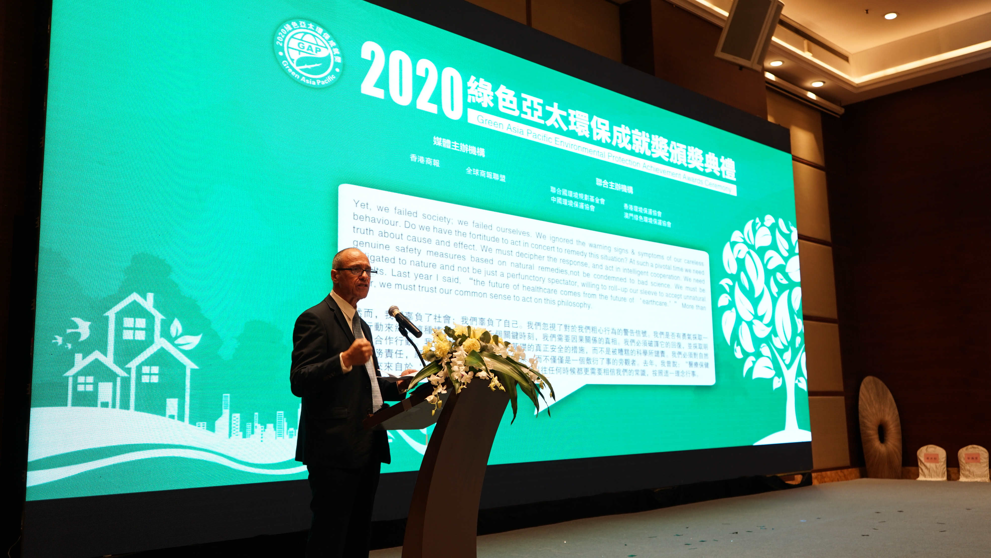 聯合國環境規劃基金會代表Victor Cauchi(維克托科希)在致辭中表示,很榮幸再次代表聯合國環境規劃基金會(UNEPF)和發言人參加今年的「綠色亞太環境保護成就獎」頒獎典禮,並在這個特殊的歷史時刻支持這一活動。2020年是值得紀念的一年。新冠疫情讓一些人並不好過,一些人消失在默默無聞中,另一些人創造了機遇,將在這一歷史分界點上蓬勃發展,讓我們比以往任何時候都處在一個新的復興開始的邊緣。地球是一個擁有生命的星球,我們有一個特殊的角色,就是守護者。面對岌岌可危的經濟和不確定的未來,我們肩負着決定生存的任務。今年的獲獎者,因為堅持不懈保護環境,為地球提供着重生機會,他們的努力不會被人們遺忘,值得特別的讚揚。感謝他們。