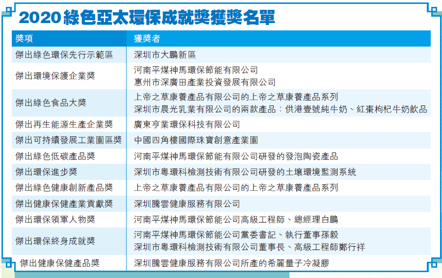 頒獎典禮上,「2020綠色亞太環保成就獎」之「傑出綠色環保先行示範區獎」授予深圳市大鵬新區;「傑出環境保護企業獎」有兩家得主,分別授予河南平煤神馬環保節能有限公司、惠州市深廣田產業投資發展有限公司;「傑出再生能源生產企業獎」授予廣東亨業環保科技有限公司;「傑出可持續發展工業園區」授予中國四角樓國際珠寶創意產業園;「傑出環保進步獎」授予深圳市粵環科檢測技術有限公司研發的土壤環境監測系統;「傑出健康保健產業貢獻獎」授予深圳騰雲健康服務有限公司。