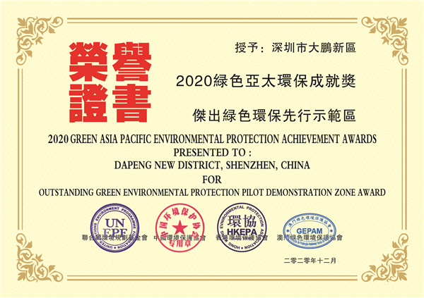12月18日晚,「2020綠色亞太環保成就獎」頒獎典禮在深圳好日子皇冠假日酒店隆重舉行。深圳市大鵬新區喜獲「2020綠色亞太環保成就獎(傑出綠色環保先行示範區)」的殊榮,生態文明建設再添一項沉甸甸的榮譽。