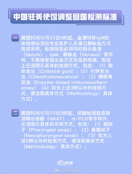 駐美國使領館現再次提醒大家慎重考慮疫情期間的感染風險,務必牢記「非必要,非緊急,不旅行」。同時,對確有緊急旅行需要的乘客進行新冠病毒核酸檢測、血清抗體檢測相關要求作出進一步規範和說明:美西時間12月23日0時起,血清特異IgM抗體檢測必須由專業醫護人員通過靜脈血方式完成採樣,檢測報告必須同時明示血清(Serum)、IgM、靜脈血(Venous)等字樣,不再接受指尖血方式完成的檢測。核酸檢測報告除須明示核酸(NAAT)、rt-PCR等字樣外,還須明示具體的採樣方式。為防止檢測後跨州旅行感染,赴華乘客須前往本人搭乘的中美間直飛航班起飛地進行核酸、抗體採樣,並送往相關實驗室檢測。