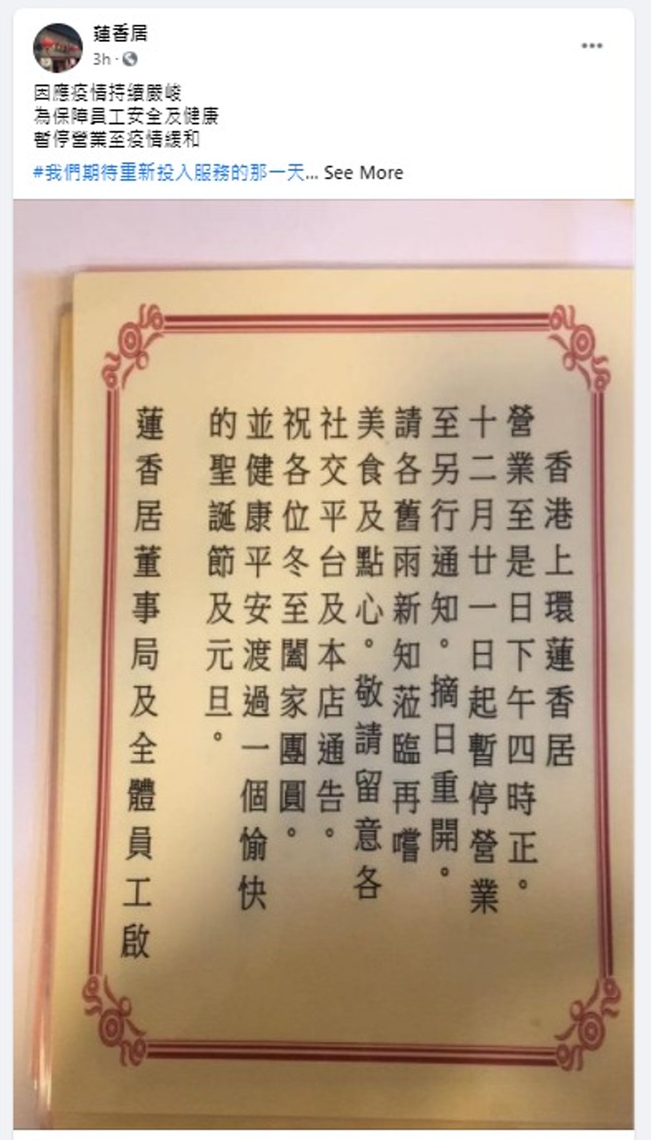 今年4月,為配合政府的防疫措施及保障員工安全,蓮香居曾於4月12日起暫停營業至同月22日,並於23日重開。
