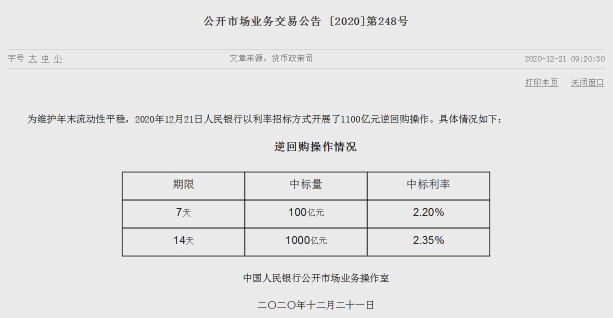 中國央行公告稱,為維護年末流動性平穩,21日以利率招標方式開展了1100億元逆回購操作,其中7天期100億元,中標利率2.20%;14天期1000億元,中標利率2.35%。