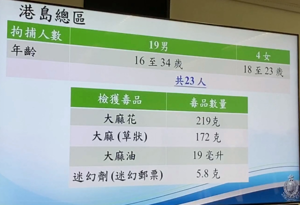 香港警方在上周一連5日在全港各區進行打擊毒品行動,拘捕39名男女,最小年紀只得16歲,行動中,檢獲23.3公斤不同種類毒品,包括冰毒、大麻、氯胺酮、海洛英、迷幻藥(LSD)及迷幻蘑菇,市值約共1250萬元。