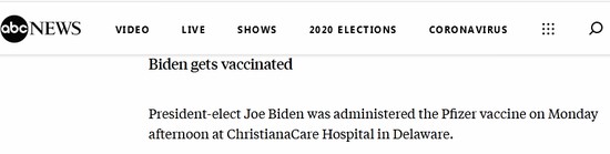 據美媒報道,當地時間12月21日下午,美國當選總統拜登在位於特拉華州的克里斯蒂安娜醫院(ChristianaCare Hospital)公開接種了輝瑞新冠疫苗。