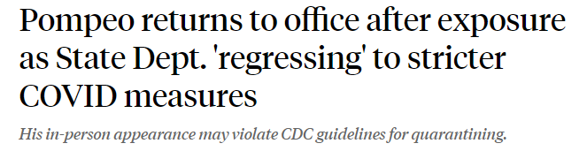 據美國廣播公司(ABC)消息,兩名美國務院官員透露,蓬佩奧於當地時間21日現身辦公室。蓬佩奧隔離還未滿一周,此舉可能違反美國疾控中心的防疫規定。