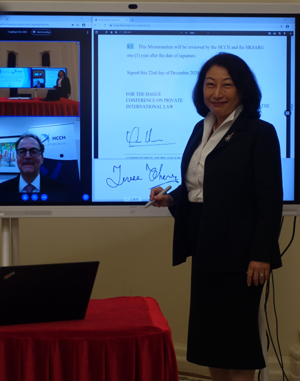 律政司司長鄭若驊資深大律師今日(22日)與海牙國際私法會議秘書長Christophe Bernasconi在網上簽署儀式上,就與法律專業人員借調計劃相關的技術及行政安排簽署諒解備忘錄。
