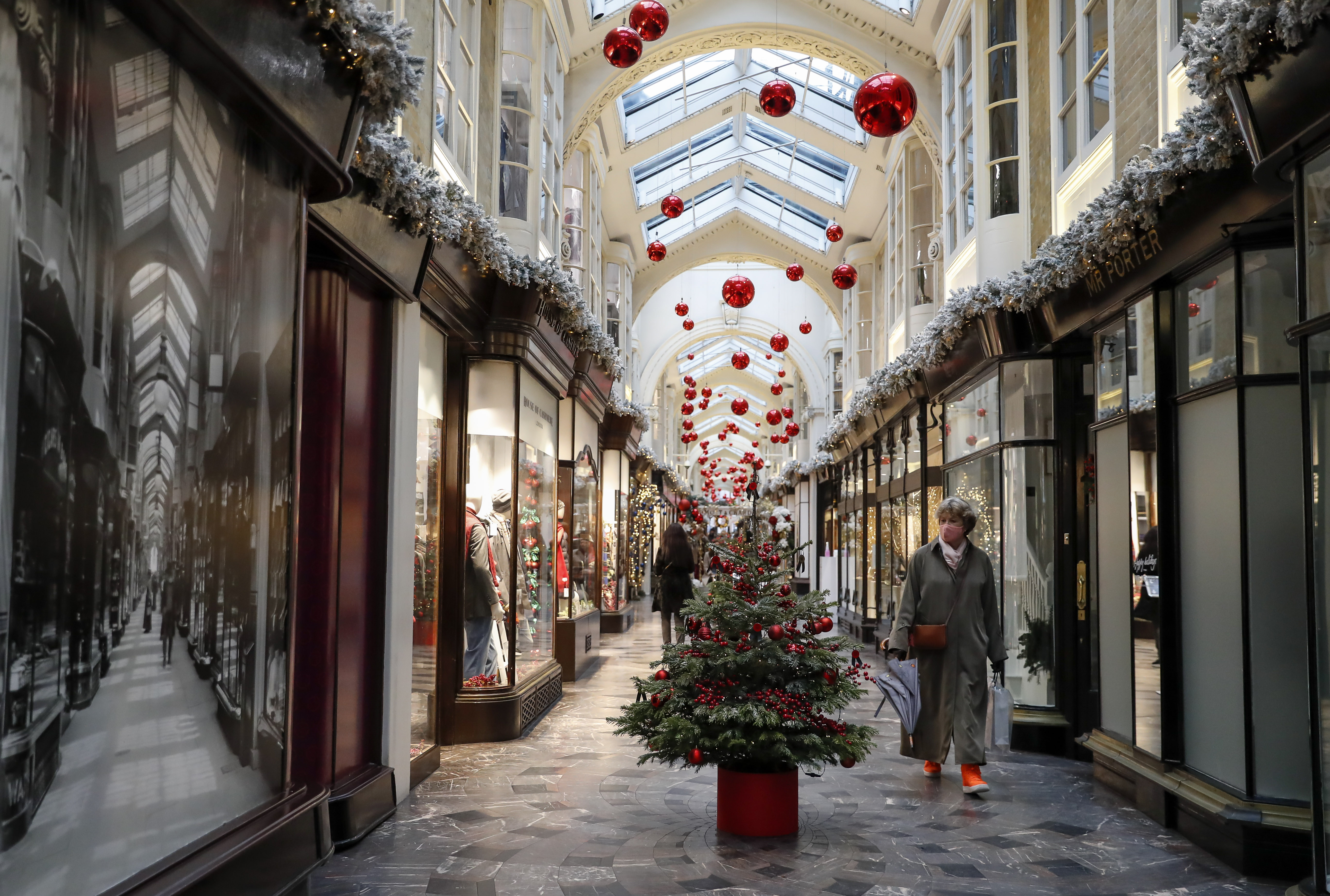 12月21日,在英國倫敦牛津街,人們從關閉店鋪前亮燈的聖誕樹旁走過。