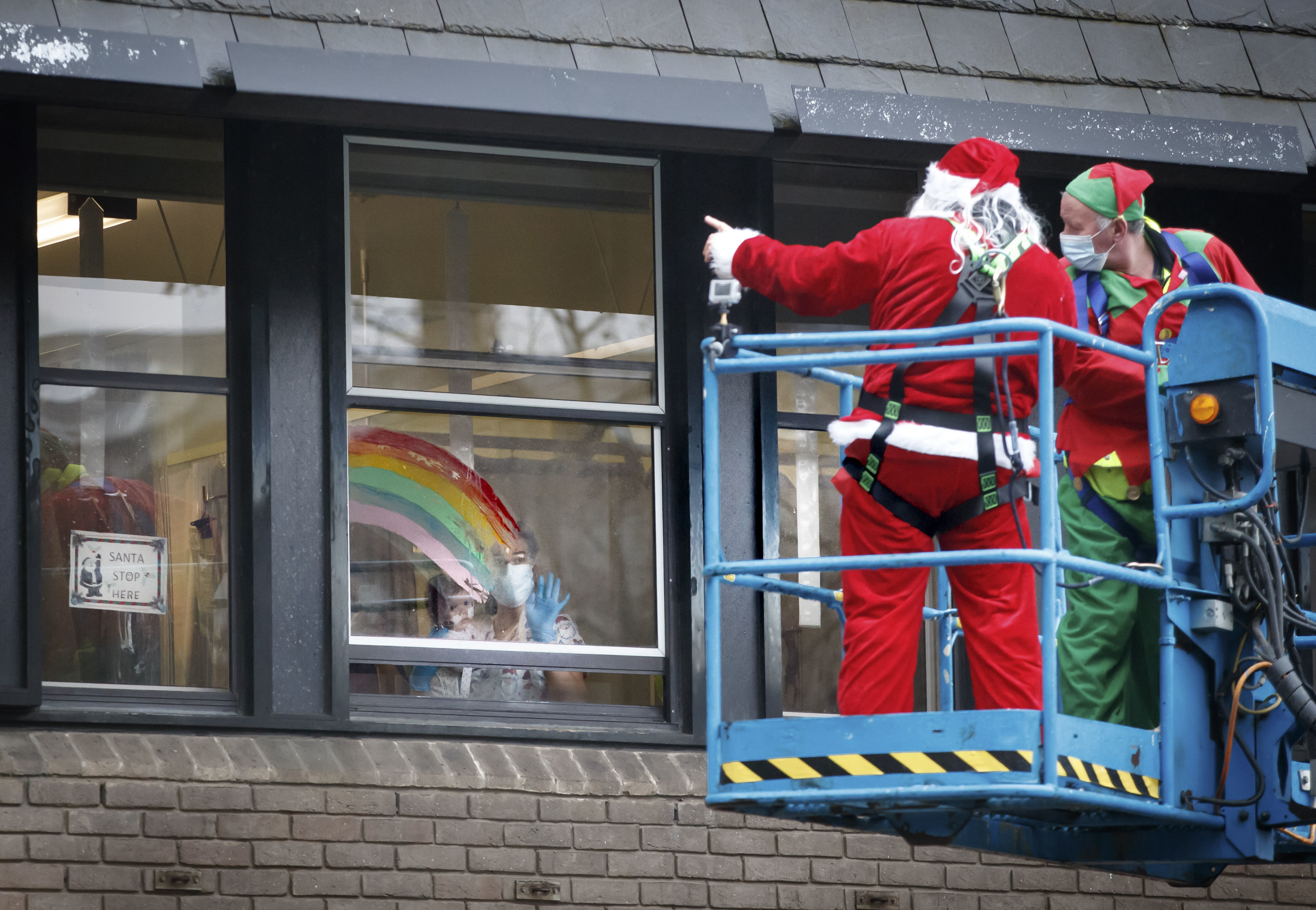 12月21日,在英國利茲,「聖誕老人」在吊車上向患病兒童艾瑪揮手。美聯社