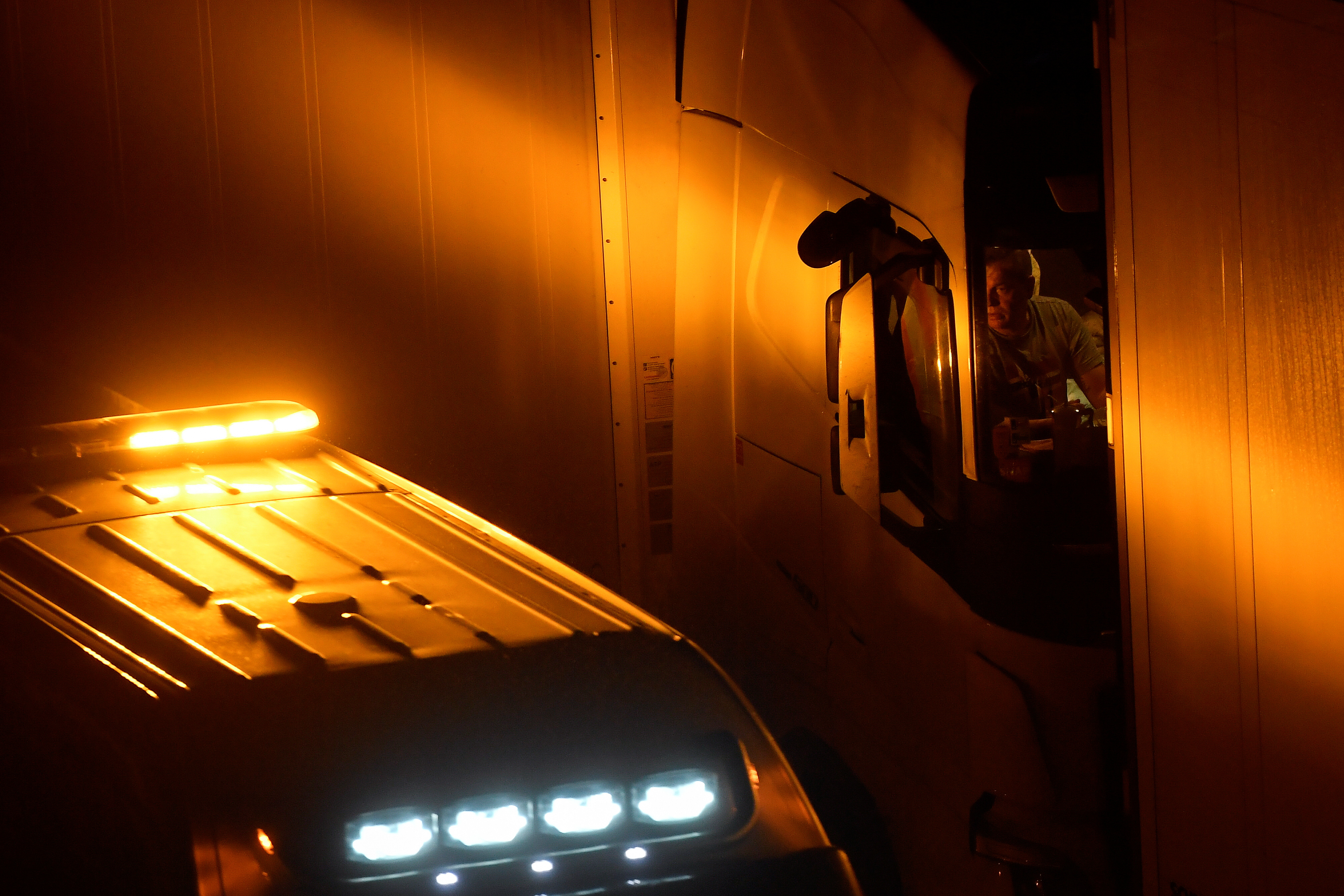 12月21日,在英國阿什福德附近的M20高速公路上,一名卡車司機由於無法出境,坐在自己的車中張望。路透社