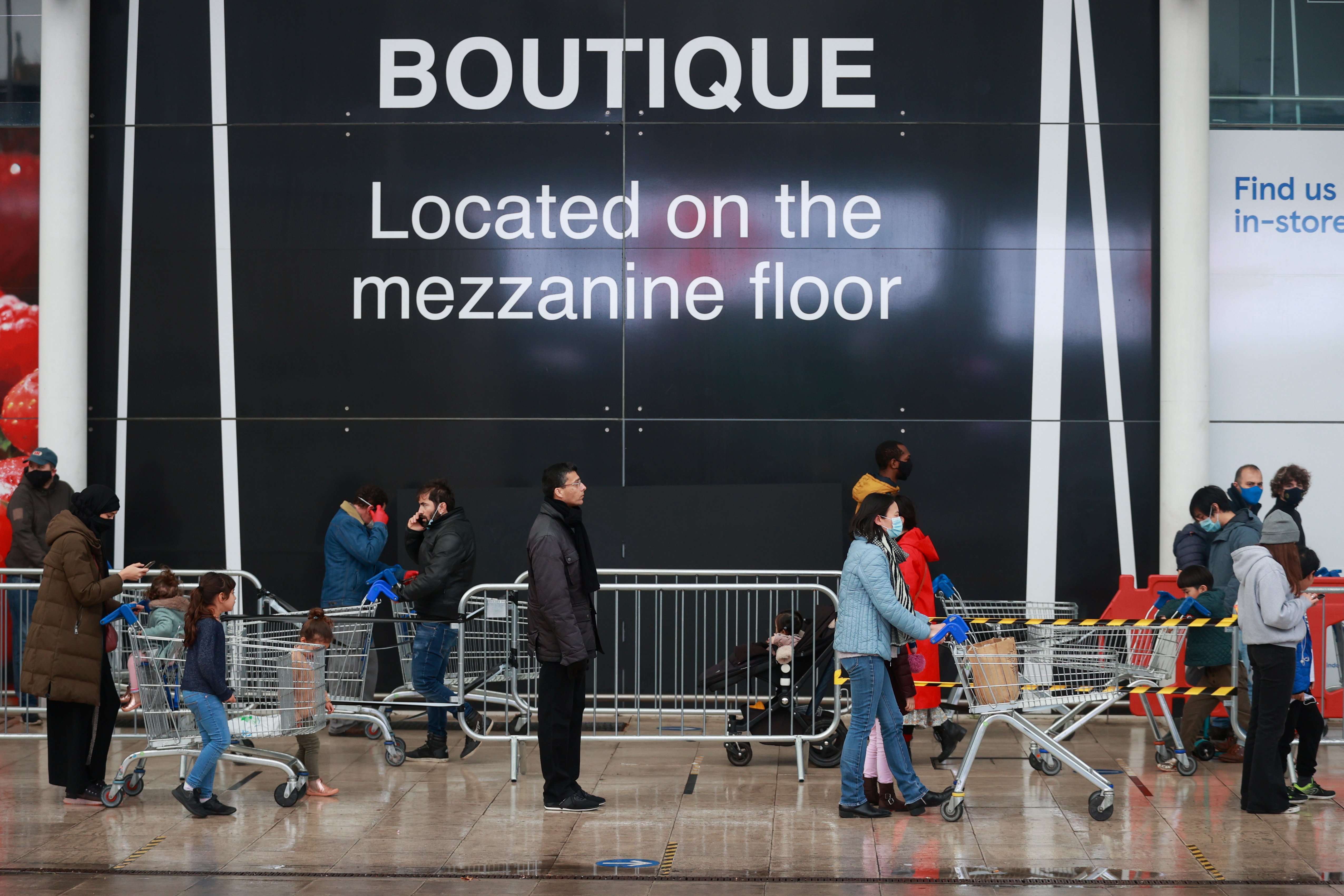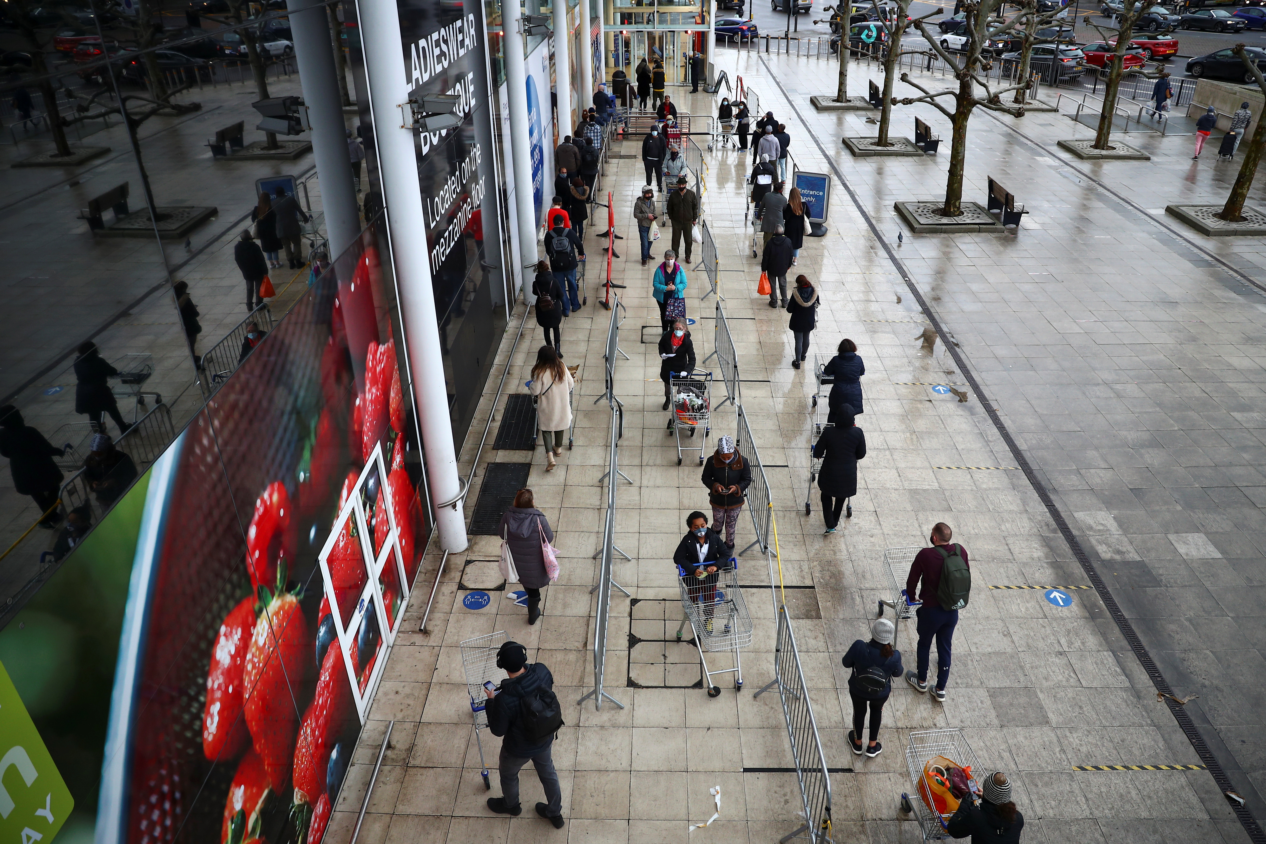 12月21日,在英國倫敦,人們進入超市前排隊等待。路透社