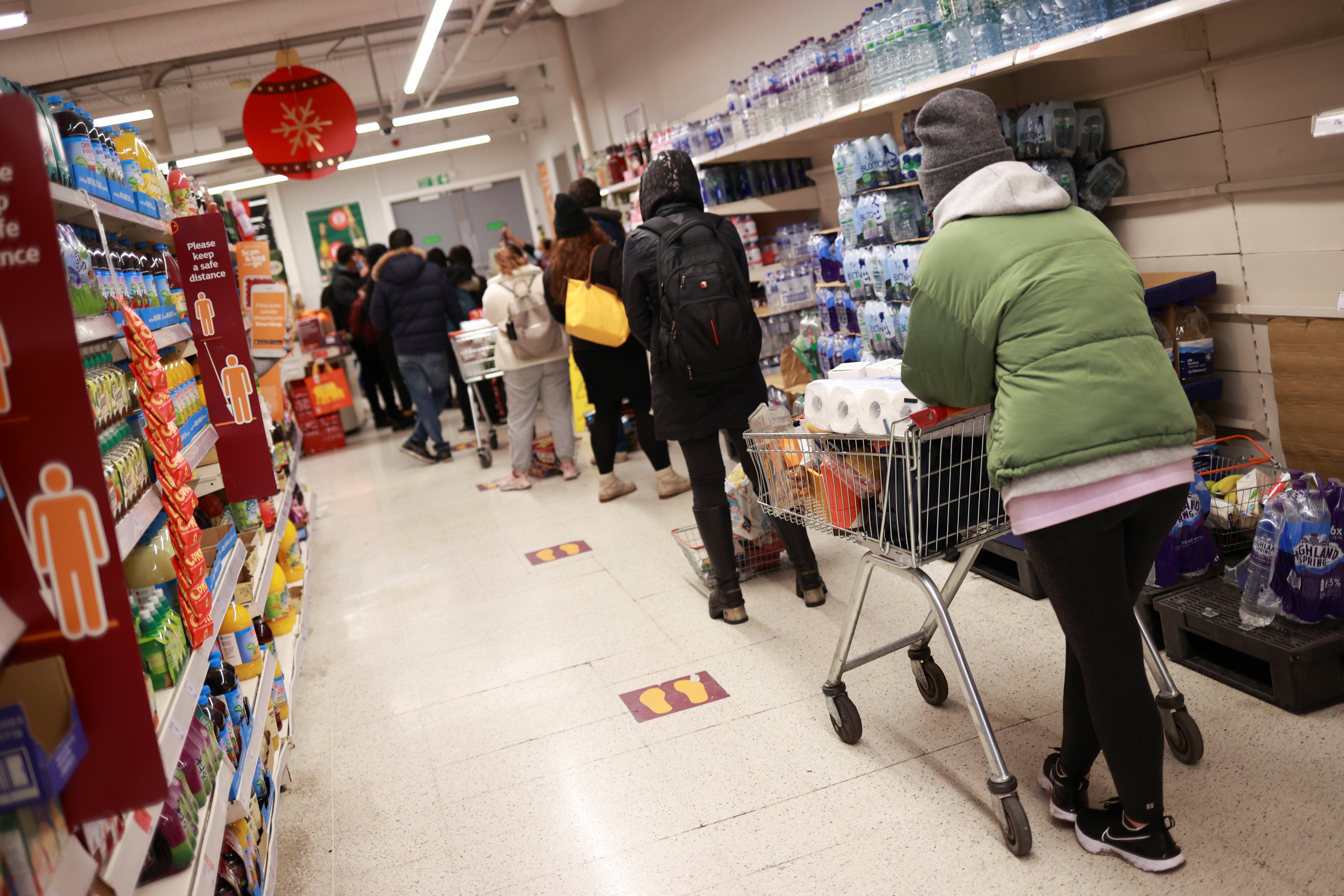 12月21日,英國倫敦,人們在商店排隊結帳。路透社